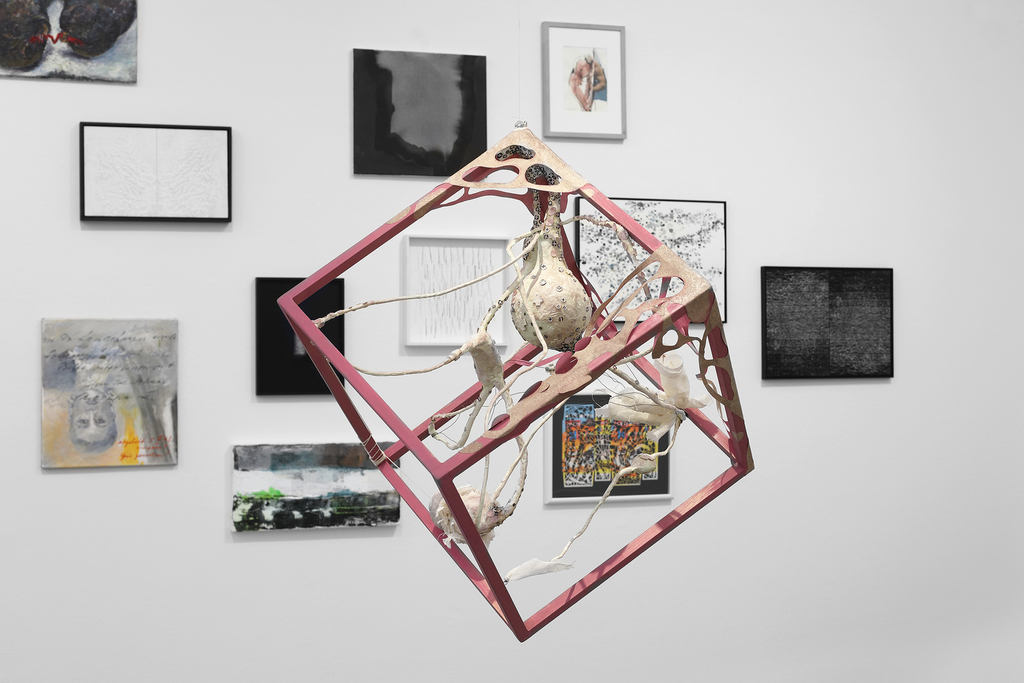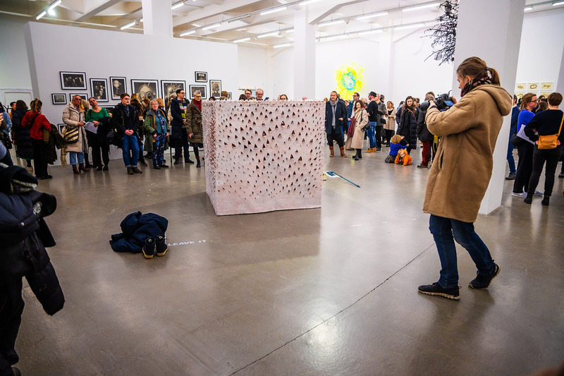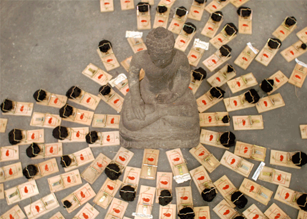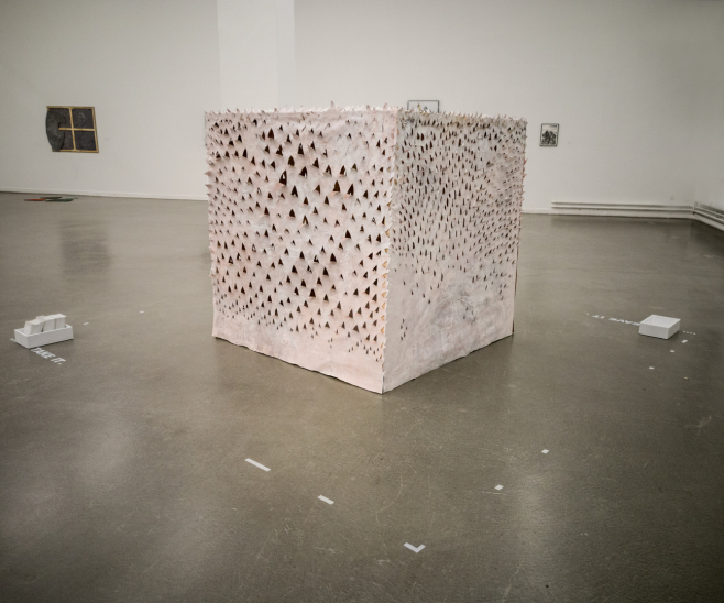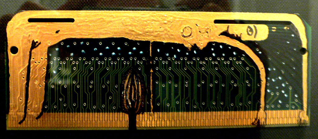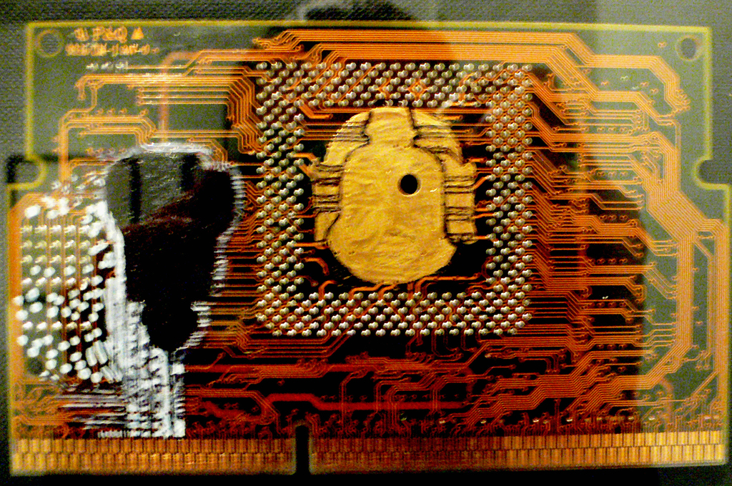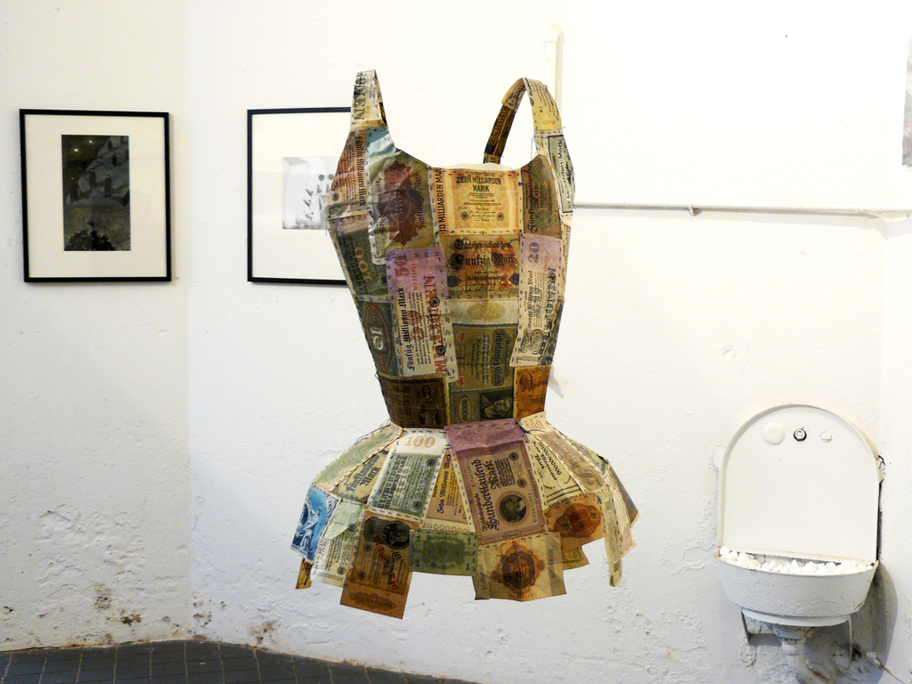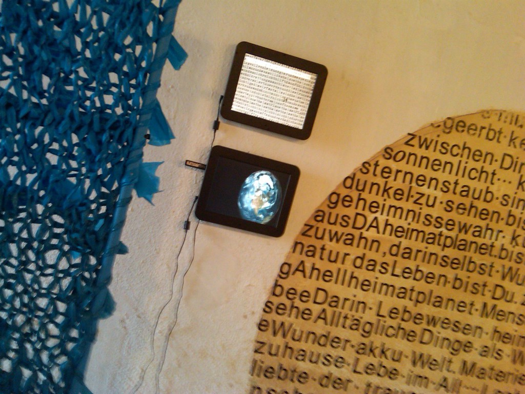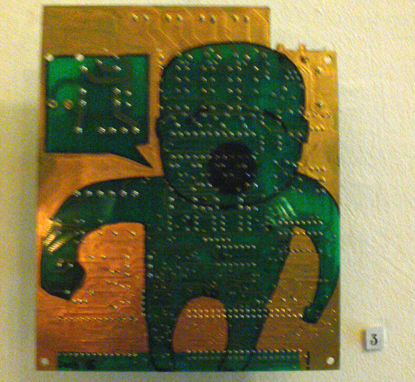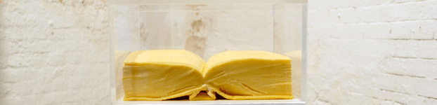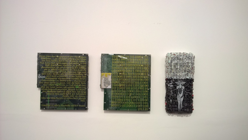 Mit Edding bemalte Festplatten werden zu Ikonen, ein 25 kg schweres Buch wird aus Käse geschnitzt und verwandelt sich mit dem passenden Titel KULTUR während der Ausstellung zu einem work in progress.