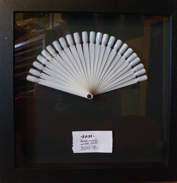 Auch ready-mades sind dabei, wie der fan - der Nagelfächer. In anderen Fällen- so wie bei Schönberg- stelle ich aus handcollorierten Kopien meiner Zeichnungen viele kleine Objekte her, die ich dann zu einem grösseren, collagierten Objekt zusammenfüge.