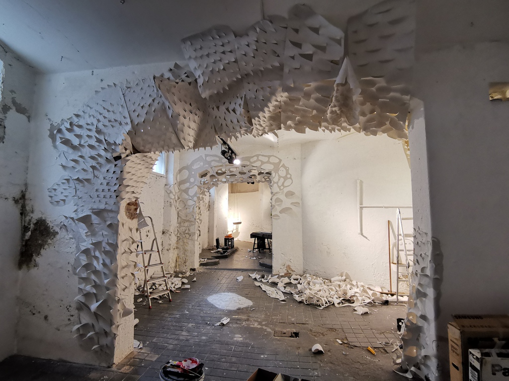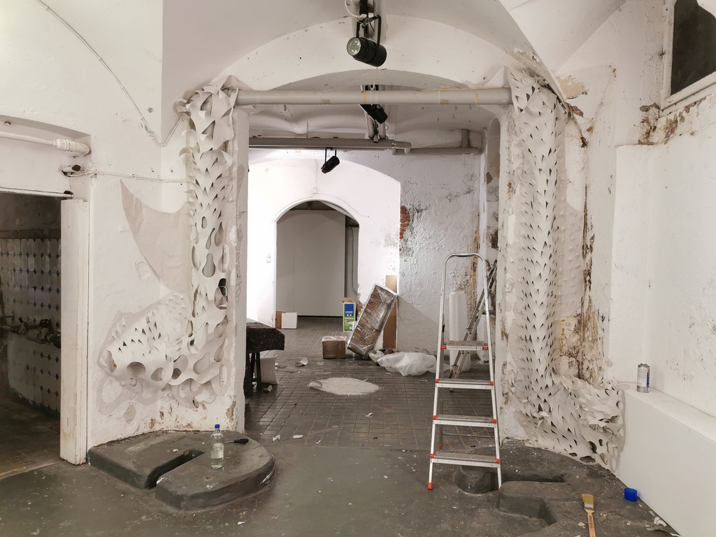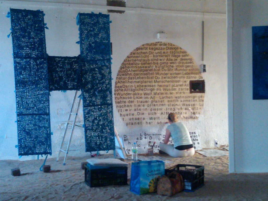 bestehend aus 365 mixed media Zeichnungen, einer Rauminstallation und der online gestellten Auf und Abbauphase mit digital erstellten Arbeitsskizzen und einer Fotodokumentation von Ulf Wiechmann und Kaffka.