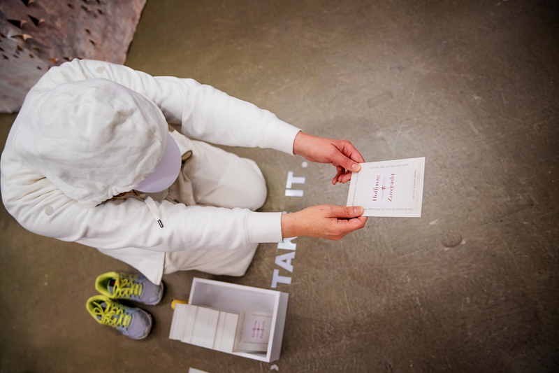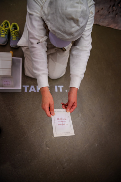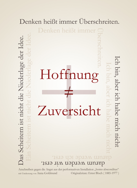 Aktiviert durch die Anwesenheit der Künstlerin werden am Abend der Eröffnung und im Rahmen der wöchentlich stattfindenden Performances die „Hoffnungsbilder gegen den Tod“, kleine Karten mit Bloch-Zitaten und Umdeutungen, die auf den Bedeutungsgehalt des Werkes rückschließen lassen zu einem Punkt der möglichen Interaktion mit der Künstlerin. Der Besucher, der im Kubus zum Dialog gebeten wird erhält eine handschriftlich hinzugefügte auf das Kärtchen gezeichnete, auf ihn bezogene Affirmation und/oder Symbole, die als „Anschreiben gegen die Angst“ mitgenommen werden dürfen.