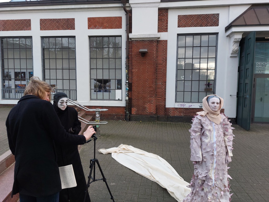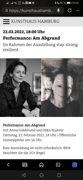 Die Frage, wie wir unseren Fluchtimpulsen begegnen, wie wir mit Angst umgehen und sie erleben und auch die Frage, ob es eine dauerhafte Befreiung von Ängsten geben kann stehen im Mittelpunkt der Performance "am Abgrund", die als performativer Akt mit Videoinhalten und sounds im Rahmen der Ausstellung "stay strong resilient" im Kunsthaus Hamburg uraufgrführt wurde.