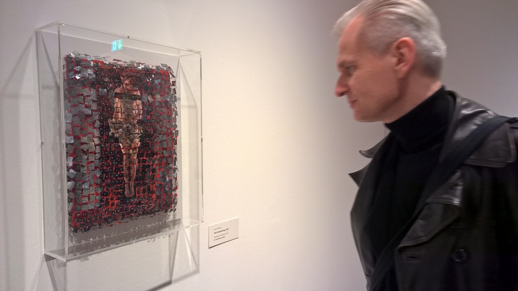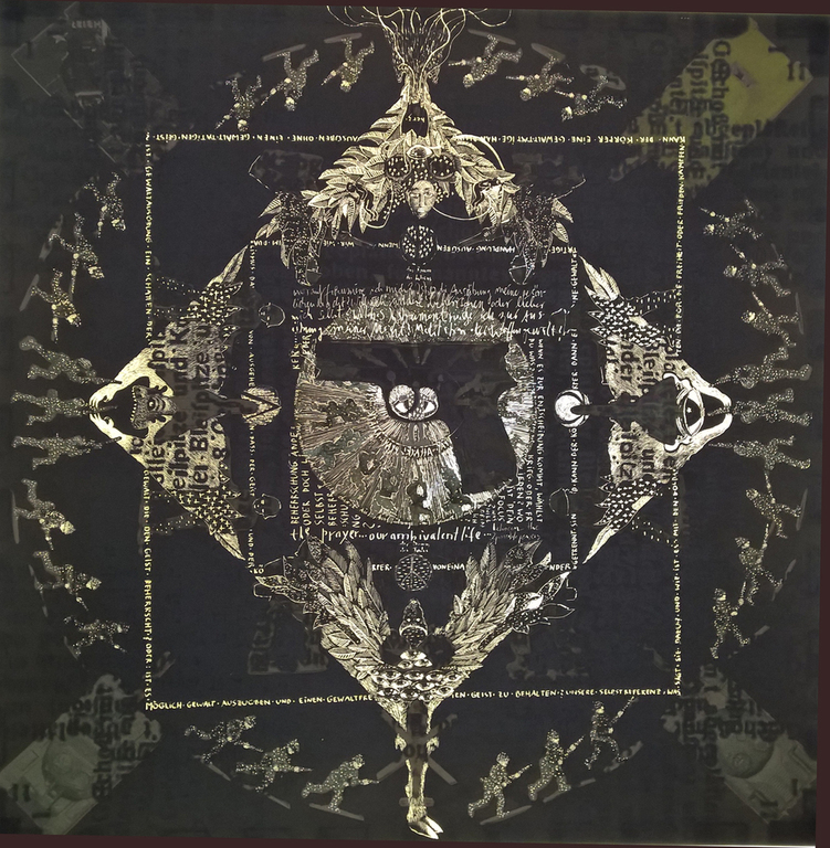 Diesem Umstand gilt seit einiger Zeit meine künstlerische Aufmerksamkeit. Sei es in meinen ambivalenten Soldatenmandalas als scrapes, in den Nadelcollagen oder den Drachenhäuten, immer liegt der Fokus auf dem schon zart oder zerbrechlich zu nennenden inneliegenden Wesen der Dinge, ihrer Exposition… den Gezeiten globaler oder persönlicher Geschichte sind sie ausgeliefert. Dabei entwickeln sie Schutzmechanismen, manchmal auch Abwehrmechanismen, die sie von Aussen betrachtet verändern. Wie weit das Aussen auf das Innen schliessen läßt, ob es in Schichten zum Kern hin Veränderungen zu erkennen gibt oder sogar das Innen dort an der eigenen Oberfläche vollständig verstellt ist, kann vielleicht auch etwas über sie aussagen.