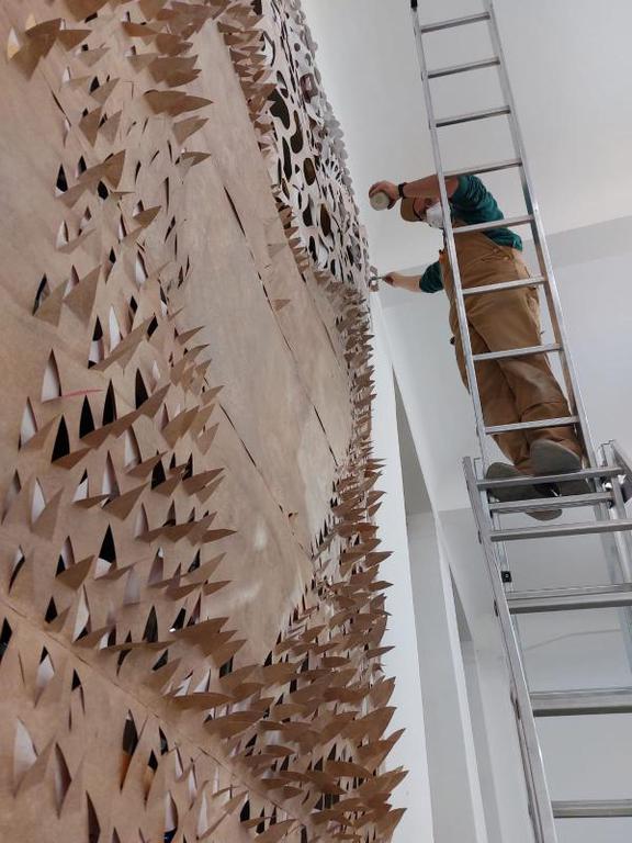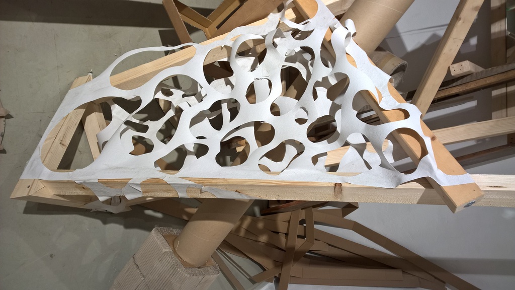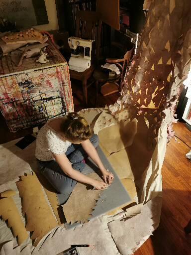 Auf Papier stelle ich unter zuhilfenahme verschiedener Materialien wie hochpigmentierter Ausziehtusche, Acryl, Kreiden und Lacke ein an Haut oder Leder erinnerndes Material her, das ich unter zuhilfenahme unterschiedlicher Schneidewerkzeuge so verändere, dass daraus eine strukturierte Oberfläche wird.